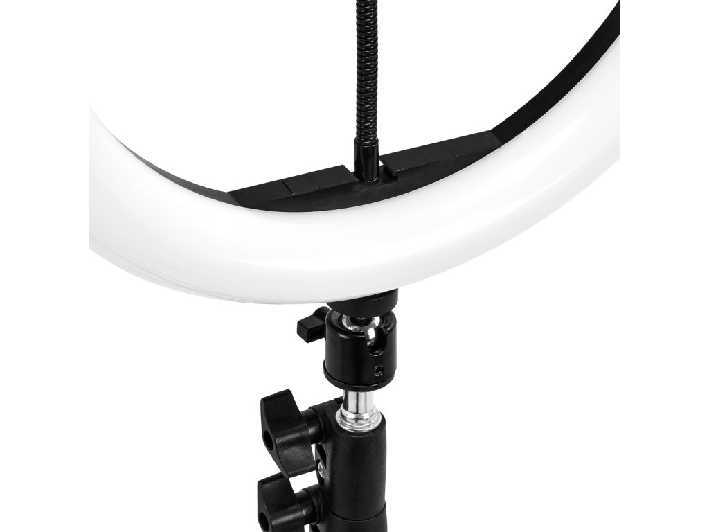 Dálkové ovládání na kabelu umožňuje krok za krokem nastavit teplotu světla v širokém rozsahu studené-středně-teplé (od 3000 do 6000 K) a ovládat intenzitu světla v 10 úrovních. Tato funkčnost poskytuje dodatečnou flexibilitu při používání lampy. Montáž na stabilní stativzaručuje pohodlnou práci v kosmetickém salonu, tetovacím studiu nebo doma. Kromě toho v kruhové lampě je umístěn závitový adaptér umožňující instalaci flexibilníhodržáku telefonu, který je součástí sady a – umožňující prodloužení kleště na maximální 15 cm – se hodí k většině chytrých telefonů dostupných na trhu.